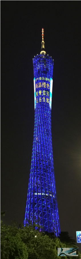 2015年7月14日高温橙色预警信号首次在广州塔LED显示屏上发布